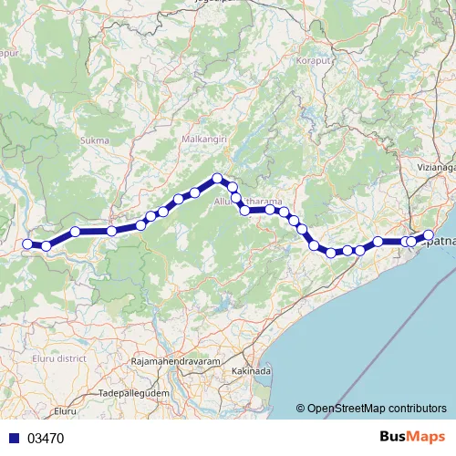 The first stop of the 03470 bus route is Bhadrachalam and the last stop is Visakhapatnam. 03470 is operational during everyday.
