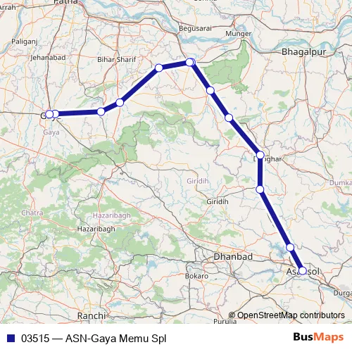 The first stop of the 03515 rail route is Asansol Jn. and the last stop is Gaya Jn. 03515 (ASN-Gaya Memu Spl) is operational during everyday.