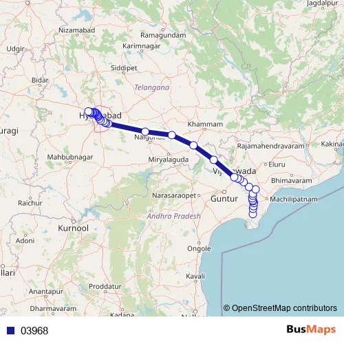 APSRTC Bus Station Inner Road - APSRTC Bus Station Inner Road - Mopidevi Main Road - Challapalli Main Road - Gudivada - Challapalli - T.Kothapalem Road - Ramanagaram - Nadakuduru Road - APSRTC Bus Station Inner Road - APSRTC Bus Stand Road - Pedestrian Walk Way - Nandigama Main Road - Narketpalli Town Road - Lakdikapul Road - Ameerpet Road - Panjagutta Main Road - Sanjeeva Reddy Nagar Main Road - Goods Shed Road, Moosapet - Service Road - Nizampet - Miyapur Road Mumbai Highway - Allwyn - Gangaram Road Mumbai Highway - Chandanagar - RC Puram BHEL Rd Mumbai Highway - RC Puram BHEL - Beeramguda Rd Mumbai Highway