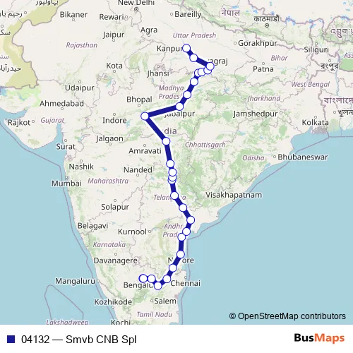 The first stop of the 04132 rail route is Smvt Bengaluru and the last stop is Kanpur Central. 04132 (Smvb CNB Spl) is operational during everyday.