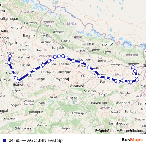 The first stop of the 04195 rail route is Agra Cantt Jn. and the last stop is Jogbani. 04195 (AGC JBN Fest Spl) is operational during everyday.