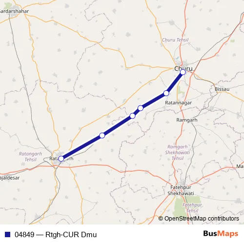 The first stop of the 04849 rail route is Ratangarh Jn and the last stop is Churu. 04849 (Rtgh-CUR Dmu) is operational during everyday.
