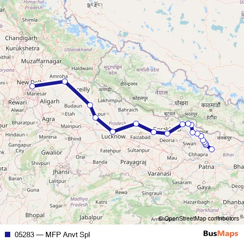 The first stop of the 05283 rail route is Muzaffarpur Jn and the last stop is Anand Vihar Terminal. 05283 (MFP Anvt Spl) is operational during everyday.