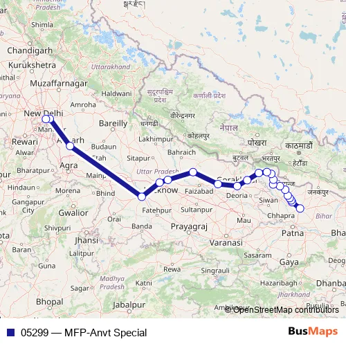 The first stop of the 05299 rail route is Muzaffarpur Jn and the last stop is Anand Vihar Terminal. 05299 (MFP-Anvt Special) is operational during everyday.
