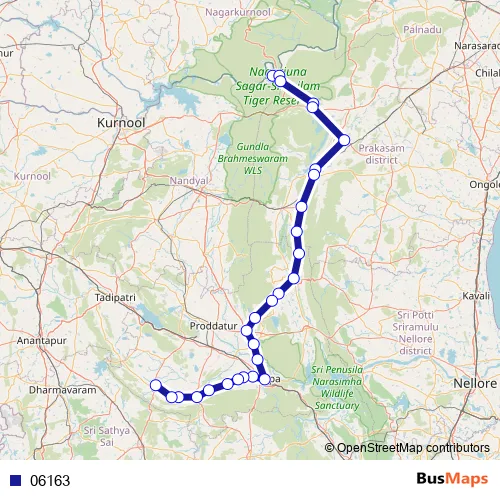 The first stop of the 06163 bus route is Srisailam and the last stop is
