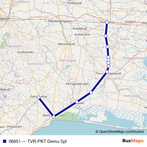 The first stop of the 06851 rail route is Thiruvarur Jn and the last stop is Pattukkottai. 06851 (TVR-PKT Demu Spl) is operational during on weekdays.