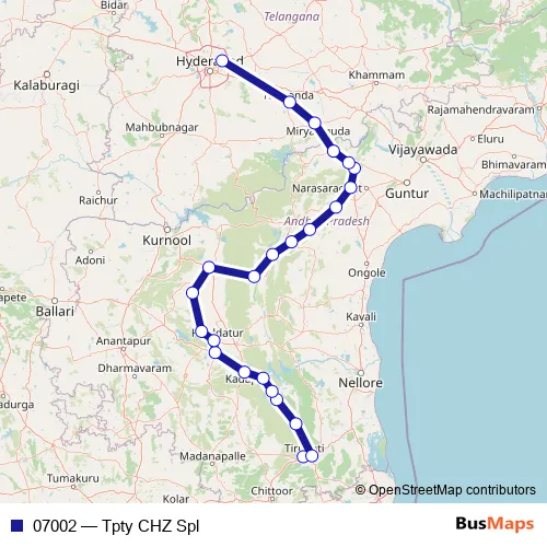 The first stop of the 07002 rail route is Tirupati and the last stop is Charlapalli. 07002 (Tpty CHZ Spl) is operational during everyday.