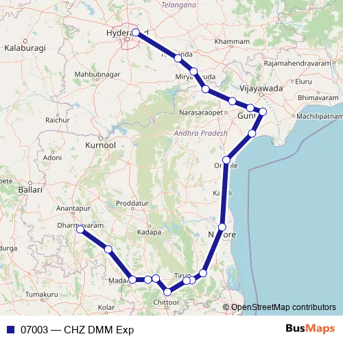 The first stop of the 07003 rail route is Charlapalli and the last stop is Dharmavaram Jn. 07003 (CHZ DMM Exp) is operational during everyday.