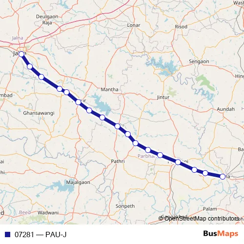 The first stop of the 07281 rail route is Purna Jn and the last stop is Jalna. 07281 (PAU-J) is operational during everyday.
