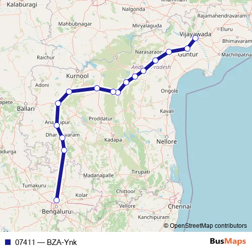 The first stop of the 07411 rail route is Vijayawada Jn and the last stop is Yelahanka Jn.. 07411 (BZA-Ynk) is operational during everyday.