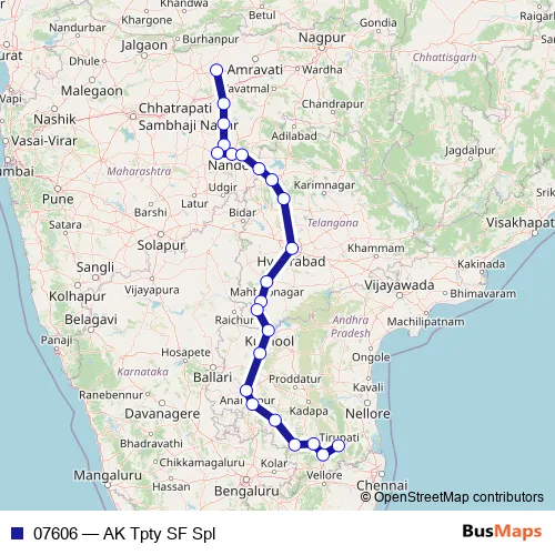 The first stop of the 07606 rail route is Akola Jn. and the last stop is Tirupati. 07606 (AK Tpty SF Spl) is operational during everyday.