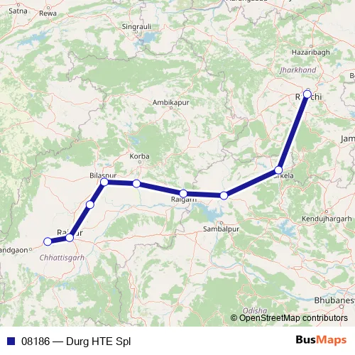 The first stop of the 08186 rail route is Durg and the last stop is Hatia. 08186 (Durg HTE Spl) is operational during everyday.