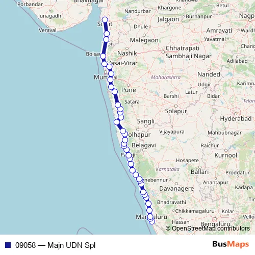The first stop of the 09058 rail route is Mangalore Junction and the last stop is Udhna Jn. 09058 (Majn UDN Spl) is operational during everyday.