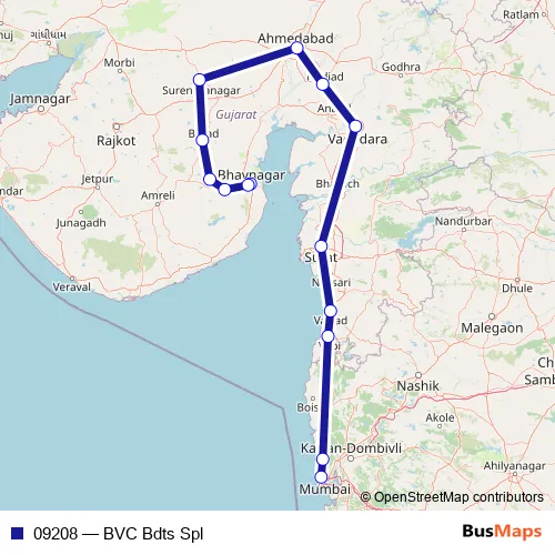 The first stop of the 09208 rail route is Bhavnagar Terminus and the last stop is Bandra Terminus. 09208 (BVC Bdts Spl) is operational during everyday.
