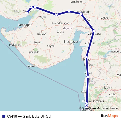 The first stop of the 09416 rail route is Gandhidham Bg and the last stop is Bandra Terminus. 09416 (Gimb Bdts SF Spl) is operational during everyday.