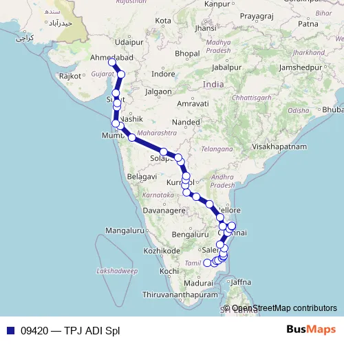The first stop of the 09420 rail route is Tiruchchirappalli Jn. and the last stop is Ahmedabad Jn. 09420 (TPJ ADI Spl) is operational during everyday.