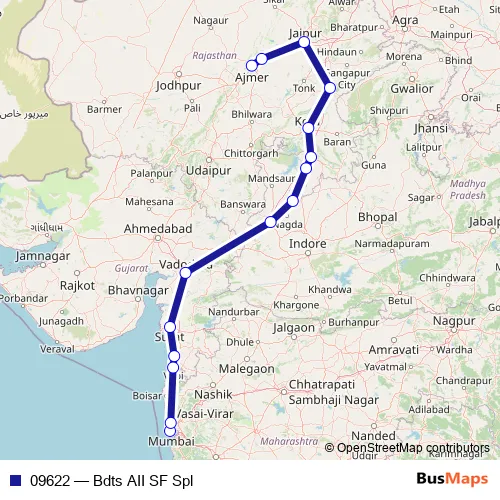 The first stop of the 09622 rail route is Bandra Terminus and the last stop is Ajmer Jn. 09622 (Bdts AII SF Spl) is operational during everyday.