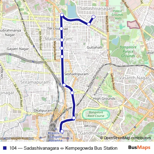The first stop of the 104 bus route is Kempegowda Bus Station and the last stop is Sadashivanagara. 104 (Sadashivanagara ⇔ Kempegowda Bus Station) is operational during everyday.