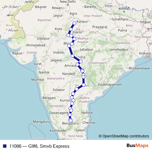The first stop of the 11086 rail route is Gwalior Jn. and the last stop is Smvt Bengaluru. 11086 (GWL Smvb Express) is operational during everyday.