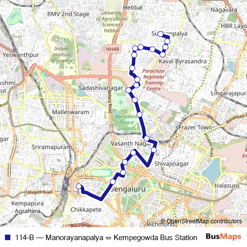 The first stop of the 114-B bus route is Manorayanapalya and the last stop is Kempegowda Bus Station. 114-B (Manorayanapalya ⇔ Kempegowda Bus Station) is operational during everyday.