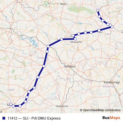 The first stop of the 11412 rail route is Sangli and the last stop is Parli Vaijnath. 11412 (SLI - Prli DMU Express) is operational during everyday.