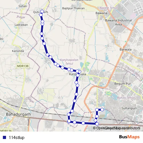 The first stop of the 114stlup bus route is Rani Khera Depot Iii and the last stop is Qutub Garh Village (T). 114stlup is operational during everyday.