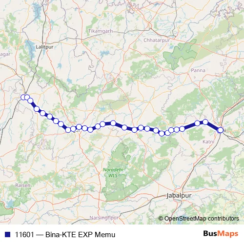The first stop of the 11601 rail route is Bina Jn and the last stop is Katni. 11601 (Bina-KTE EXP Memu) is operational during everyday.