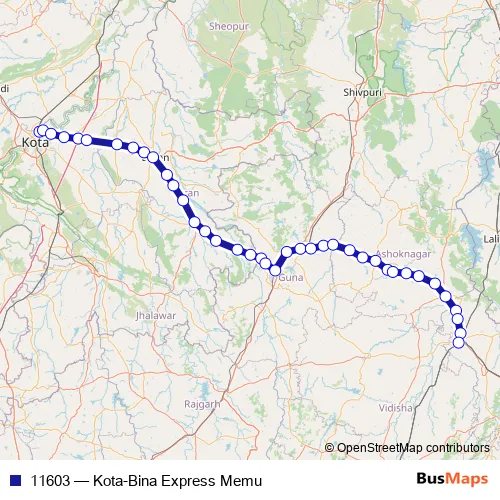 The first stop of the 11603 rail route is Kota Jn and the last stop is Bina Jn. 11603 (Kota-Bina Express Memu) is operational during everyday.