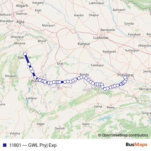 The first stop of the 11801 rail route is Gwalior Jn. and the last stop is Prayagraj Jn. 11801 (GWL Pryj Exp) is operational during everyday.