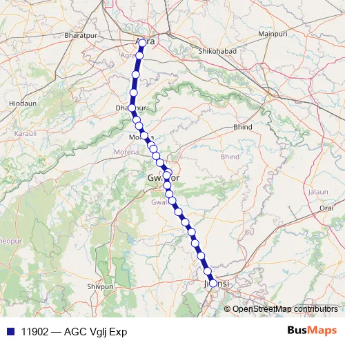 The first stop of the 11902 rail route is Agra Cantt Jn. and the last stop is Virangana Lakshmibai Jhansi Jn. 11902 (AGC Vglj Exp) is operational during everyday.