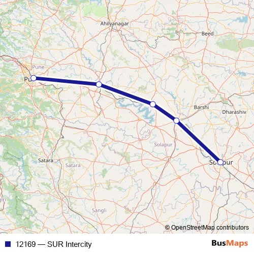The first stop of the 12169 rail route is Pune Jn and the last stop is Solapur Jn. 12169 (SUR Intercity) is operational during everyday.