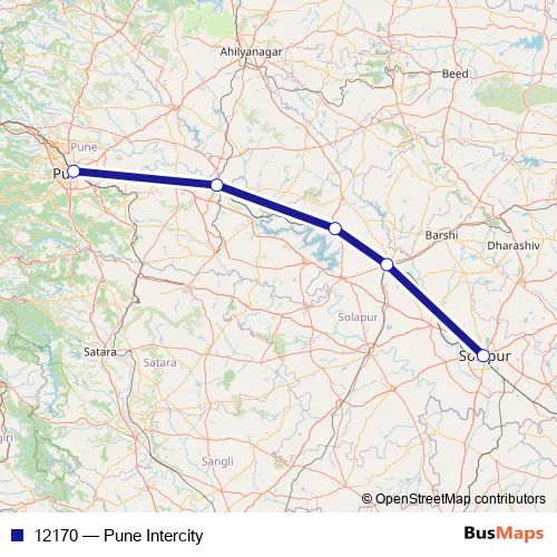 The first stop of the 12170 rail route is Solapur Jn and the last stop is Pune Jn. 12170 (Pune Intercity) is operational during everyday.