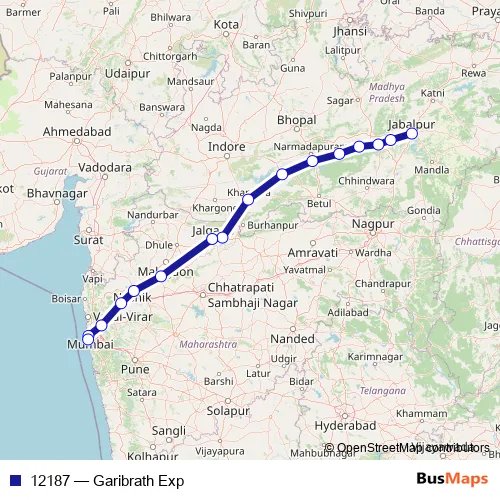 The first stop of the 12187 rail route is Jabalpur and the last stop is C Shivaji MAH T. 12187 (Garibrath Exp) is operational during everyday.
