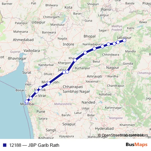 The first stop of the 12188 rail route is C Shivaji MAH T and the last stop is Jabalpur. 12188 (JBP Garib Rath) is operational during everyday.