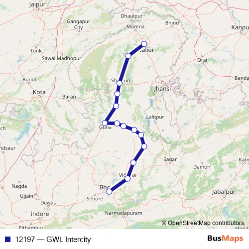 The first stop of the 12197 rail route is Bhopal Jn. and the last stop is Gwalior Jn.. 12197 (GWL Intercity) is operational during everyday.