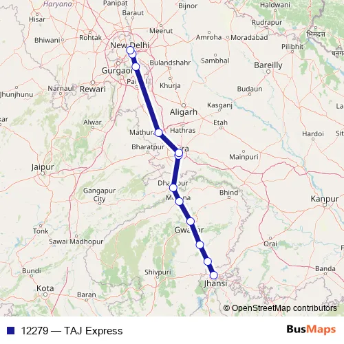 The first stop of the 12279 rail route is Virangana Lakshmibai Jhansi Jn and the last stop is NEW Delhi. 12279 (TAJ Express) is operational during everyday.