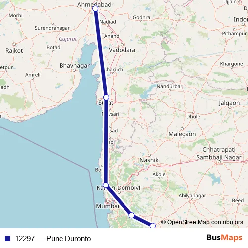 The first stop of the 12297 rail route is Ahmedabad Jn and the last stop is Pune Jn. 12297 (Pune Duronto) is operational during everyday.