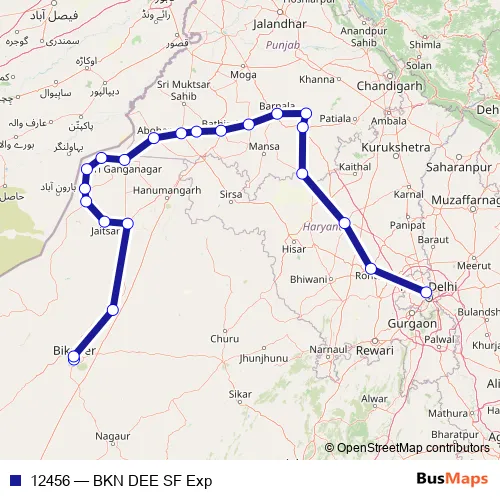 The first stop of the 12456 rail route is Bikaner Jn and the last stop is Delhi Sarai Rohilla. 12456 (BKN DEE SF Exp) is operational during everyday.