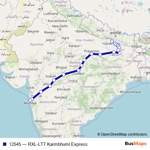 The first stop of the 12545 rail route is Raxaul Jn and the last stop is Lokmanyatilak. 12545 (RXL-LTT Karmbhumi Express) is operational during everyday.
