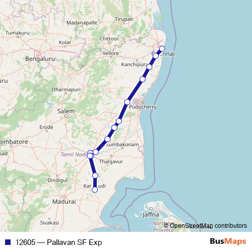 The first stop of the 12605 rail route is Chennai Egmore and the last stop is Karaikkudi Jn. 12605 (Pallavan SF Exp) is operational during everyday.