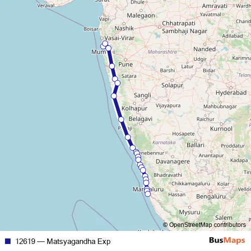The first stop of the 12619 rail route is Lokmanyatilak and the last stop is Mangalore Central. 12619 (Matsyagandha Exp) is operational during everyday.