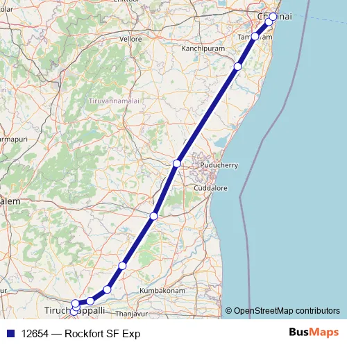 The first stop of the 12654 rail route is Tiruchchirappalli Jn. and the last stop is Chennai Egmore. 12654 (Rockfort SF Exp) is operational during everyday.