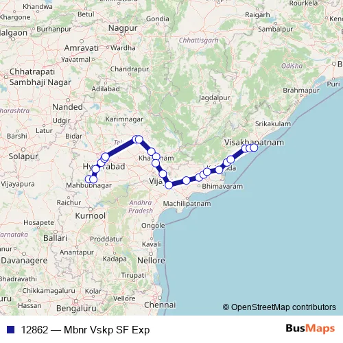 The first stop of the 12862 rail route is Mahbubnagar and the last stop is Visakhapatnam. 12862 (Mbnr Vskp SF Exp) is operational during everyday.