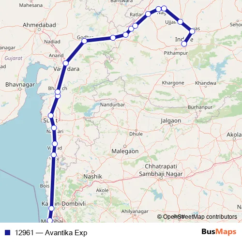 The first stop of the 12961 rail route is Mumbai Central and the last stop is Indore Jn. 12961 (Avantika Exp) is operational during everyday.