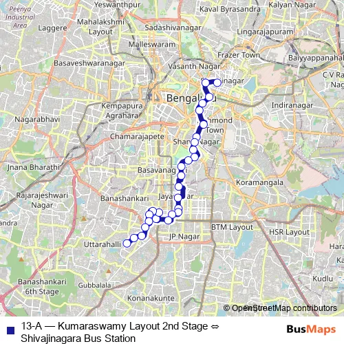 The first stop of the 13-A bus route is Shivajinagara Bus Station and the last stop is Kumaraswamy Layout 2nd Stage. 13-A (Kumaraswamy Layout 2nd Stage ⇔ Shivajinagara Bus Station) is operational during everyday.