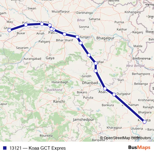 The first stop of the 13121 rail route is Kolkatta Terminal and the last stop is Ghazipur City. 13121 (Koaa GCT Expres) is operational during everyday.