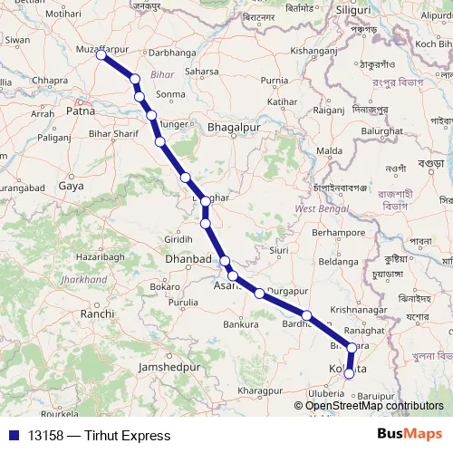 The first stop of the 13158 rail route is Muzaffarpur Jn and the last stop is Kolkatta Terminal. 13158 (Tirhut Express) is operational during everyday.
