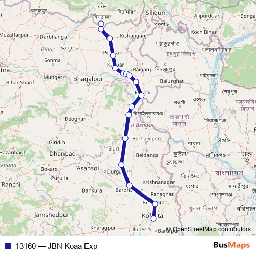 The first stop of the 13160 rail route is Jogbani and the last stop is Kolkatta Terminal. 13160 (JBN Koaa Exp) is operational during everyday.
