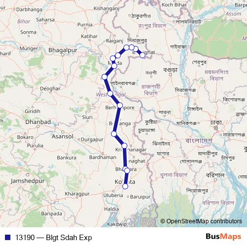 The first stop of the 13190 rail route is Balurghat and the last stop is Sealdah. 13190 (Blgt Sdah Exp) is operational during everyday.