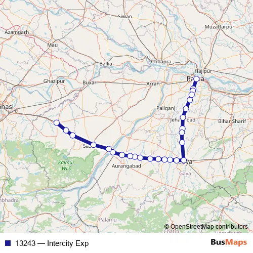 The first stop of the 13243 rail route is Patna Jn and the last stop is Bhabua Road. 13243 (Intercity Exp) is operational during everyday.